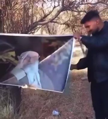 It shows him holding a large poster of Iran’s highest leader,Ali Khamenei,overlaid with the voice of the last Shah,Mohammad Reza Pahlavi,who fled to exile during the Islamic Revolution.